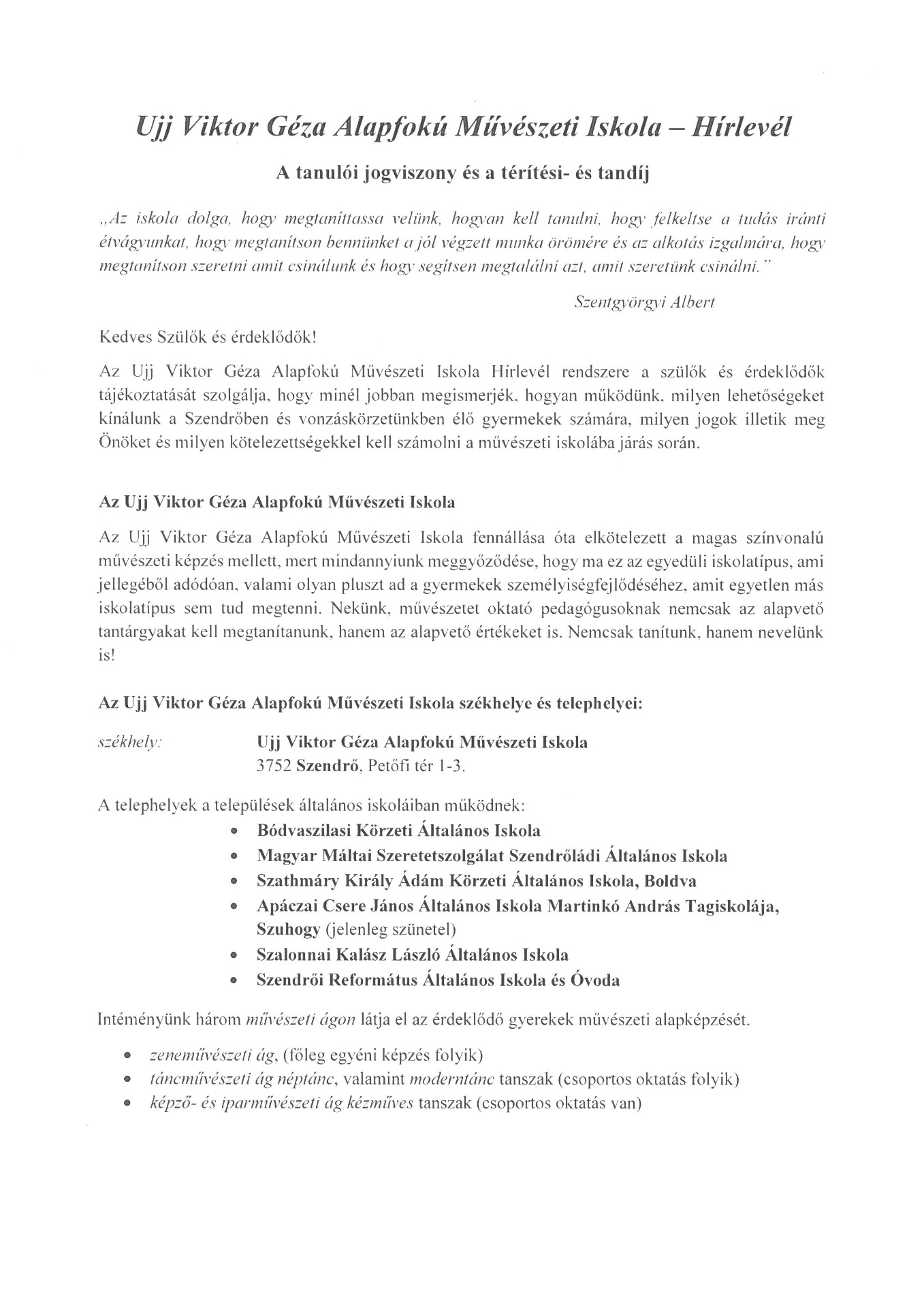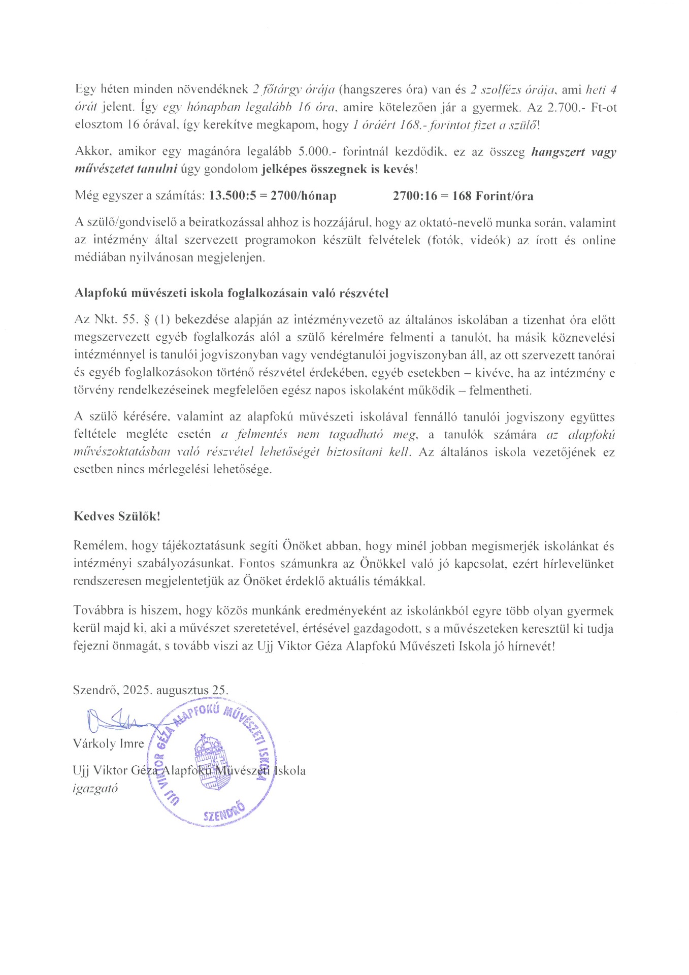 Az Ujj Viktor Géza Alapfokú Művészeti Iskola 20 éve elkötelezett a magas színvonalú művészeti képzés mellett, mert mindannyiunk meggyőződése, hogy ma ez az egyedüli iskolatípus, ami jellegéből adódóan, valami olyan pluszt ad a gyermekek személyiségfejlődéséhez, amit egyetlen más iskolatípus sem tud megtenni. Hisszük, hogy közös munkánk eredményeként az iskolánkból egyre több olyan gyermek kerül majd ki, aki a művészet szeretetével, értésével gazdagodott, s a művészeteken keresztül ki tudja fejezni önmagát, s tovább viszi intézményünk jó hírnevét! Az Ujj Viktor Géza Alapfokú Művészeti Iskola 20 éves jubileumi ünnepségét és karácsonyváró hangversenyét 2024. december 16-án tartotta az intézmény hangversenytermében. A rendezvényen felléptek az iskola régi és jelenlegi diákjai, pedagógusai, valamint az intézmény kamaraegyüttesei, kamarakórusa és a Szendrő Brass Rézfúvós Együttes. Jó volt látni és hallani azokat a növendékeinket, akik országos versenyeken is a legjobbak között végeznek, és hallottunk olyan volt tanulónkat, aki már a zenei pályát választotta és örömmel vállalta volt iskolájában a bemutatkozást. A rendezvény végén az intézmény igazgatója elismeréseket adott át mindazoknak, akik az elmúlt időszakban segítették és támogatták az iskola céljainak elérését. Ezúton is köszönjük a Kazincbarcikai Tankerületi Központ és a Szendrő és Környéke Gyermekeiért a Művészetoktatásban Alapítvány erkölcsi és anyagi támogatását a rendezvény színvonalas lebonyolításához.